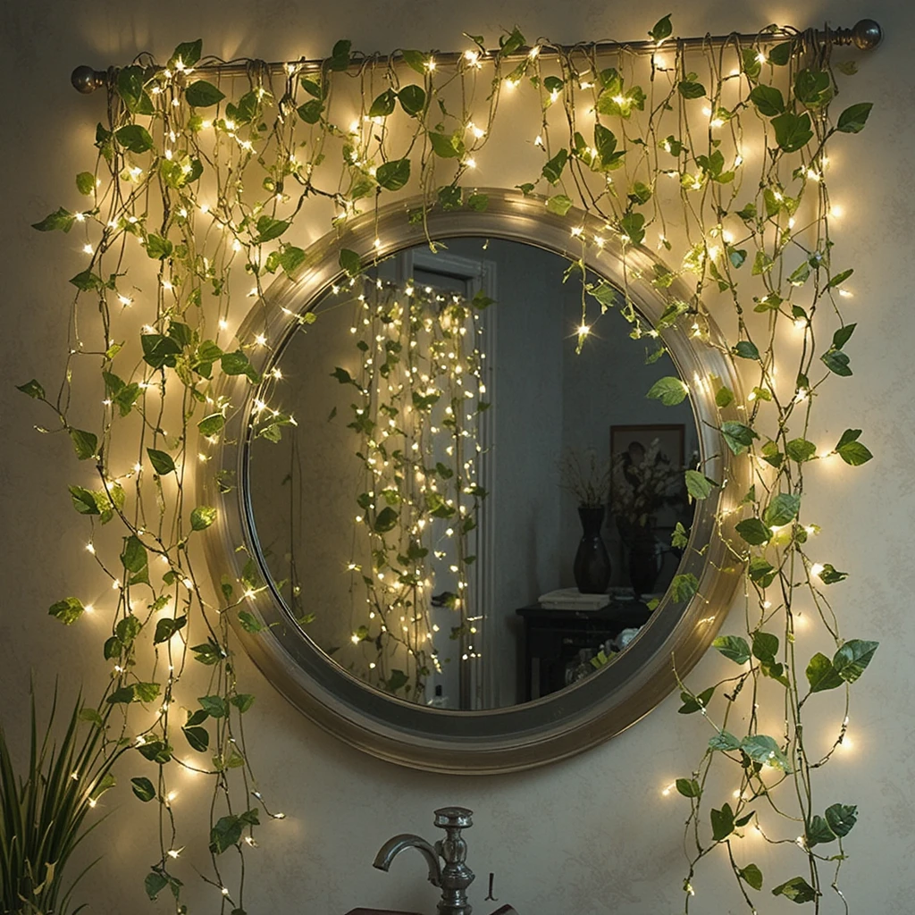 Add moisture-safe leaf fairy lights around your bathroom mirror or wall for a spa-like touch. The mix of light and leaves gives a fresh, rejuvenating vibe.