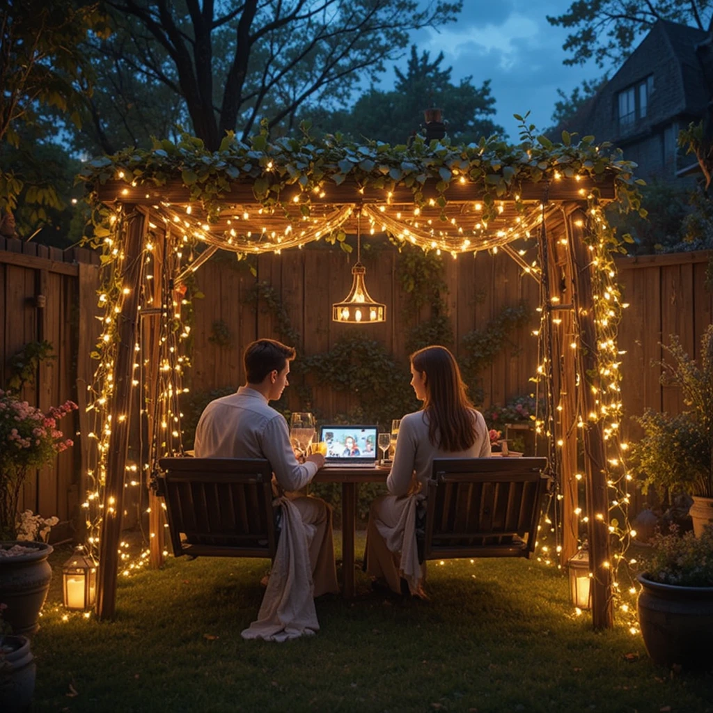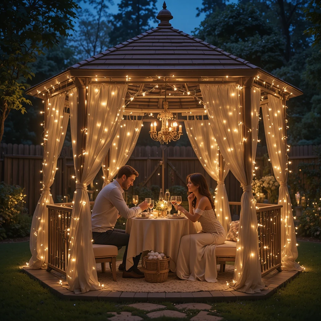 If you have a gazebo or small outdoor space, decorate it with fairy lights draped along the roof and pillars. Add a table with light snacks or desserts, and play soft background music. The gentle glow from the lights makes the whole setup feel warm, romantic, and picture-perfect for an evening together.