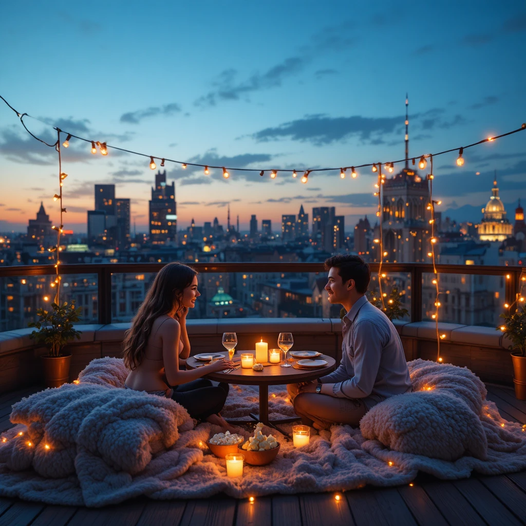 Set up a projector on your rooftop and surround your space with warm string lights. Throw in some fluffy blankets, popcorn, and your favorite romantic movie. The combination of city views and glowing lights sets the perfect cinematic date mood. Fairy Light Date