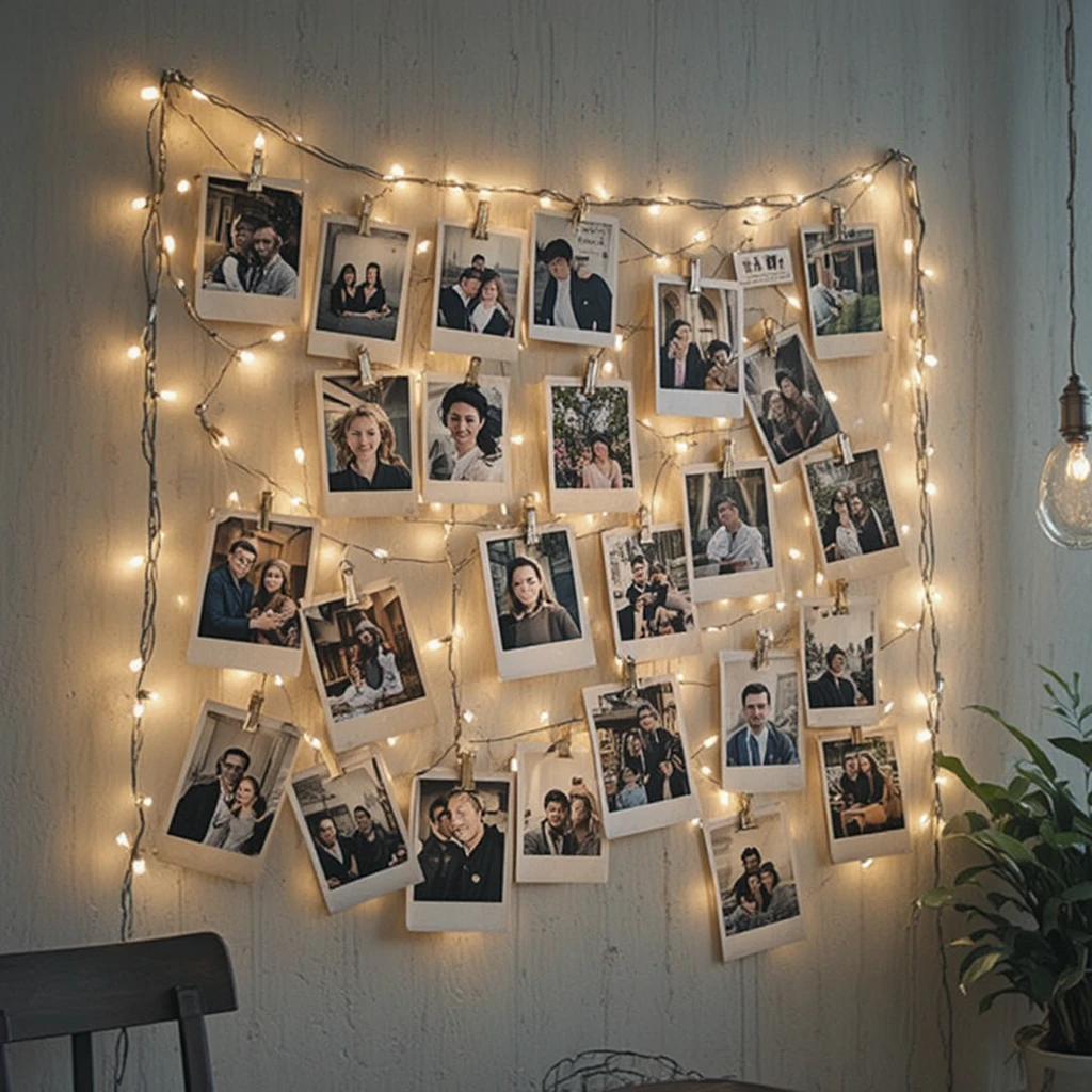 Use fairy lights with clips to display your favorite memories on the wall. Each twinkling bulb highlights precious moments while adding a cozy, personal touch.