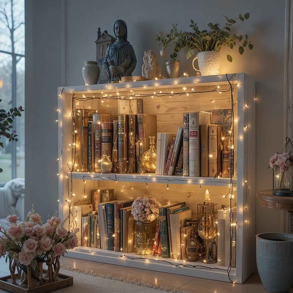 Weave fairy lights through books or along your bookshelf edges. It turns an ordinary shelf into a glowing statement piece full of charm and personality. Fairy Lights Decor