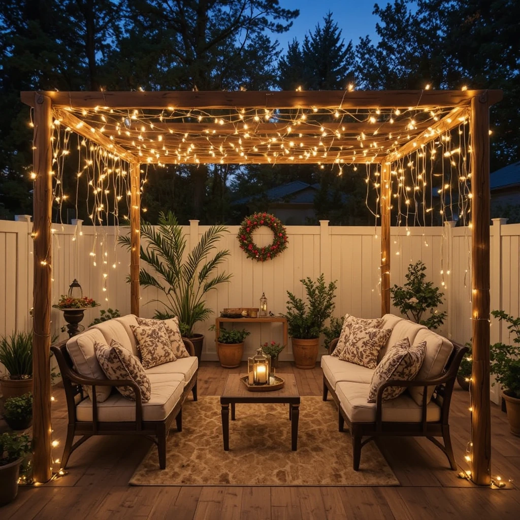 Hang fairy lights above your patio seating to create an open-air canopy. This setup turns any outdoor space into a dreamy nighttime gathering spot.