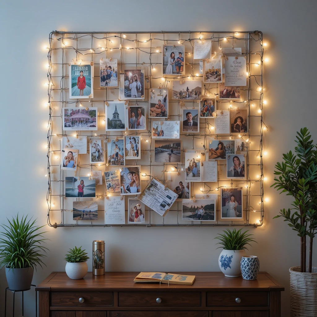 Attach fairy lights to a wire grid wall and add photos, postcards, or quotes. It’s an easy DIY project that transforms dull walls into a glowing memory board full of personality.