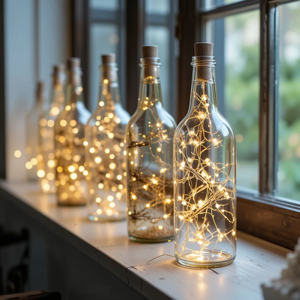 Place fairy lights inside clear glass bottles or mason jars for rustic charm. Perfect for tables or window sills, this idea works well for both indoor and outdoor spaces. Fairy Lights Decor
