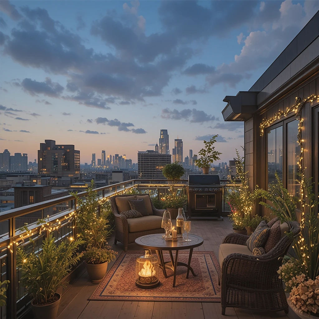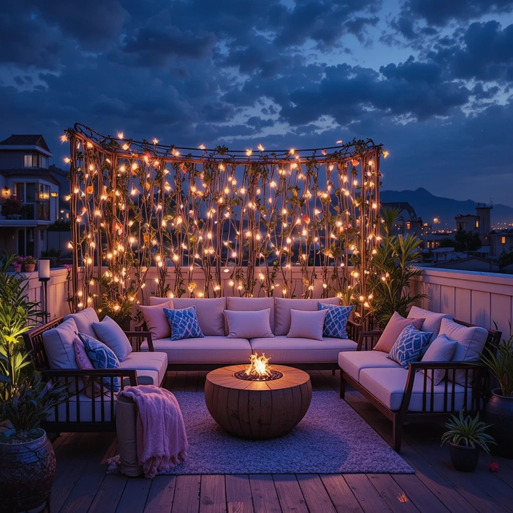 Add fairy lights around your hanging plants or flower baskets. The reflection off greenery makes your rooftop feel lush and serene even after sunset. Fairy Lights Rooftop