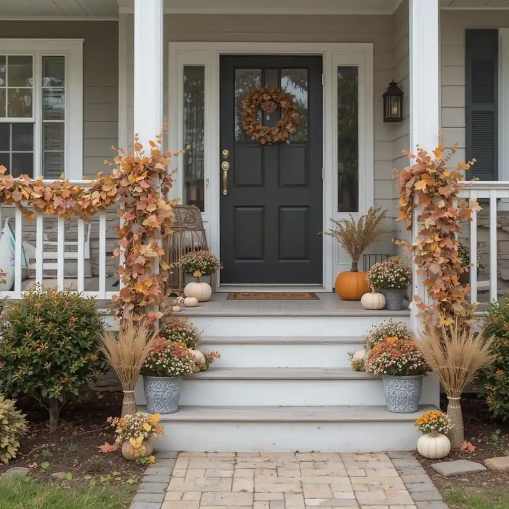 Wrap artificial fall leaf garland around porch railings, stair banisters, or fencing. It adds a rich, vibrant texture that instantly says autumn.