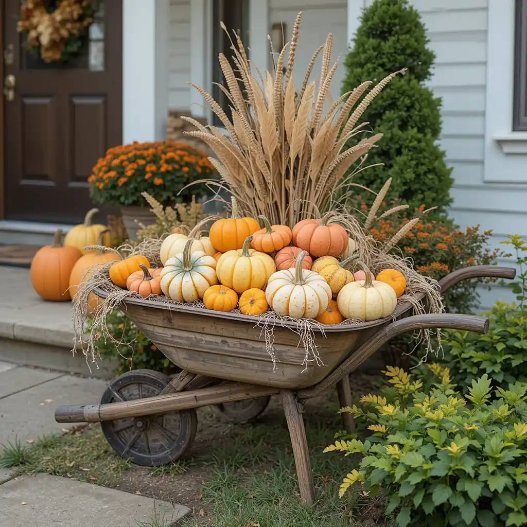 Repurpose an old wheelbarrow and fill it with colorful gourds, mini pumpkins, or dried corn. This idea works great in both small and large yards, adding a true harvest market vibe.