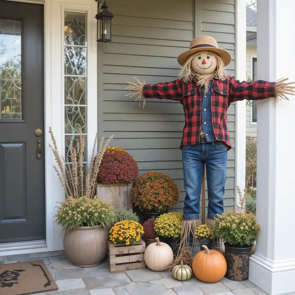 Create a fun scarecrow using old flannel shirts, jeans, and a straw hat. Place it near the garden or porch for a whimsical and festive touch that kids especially enjoy.