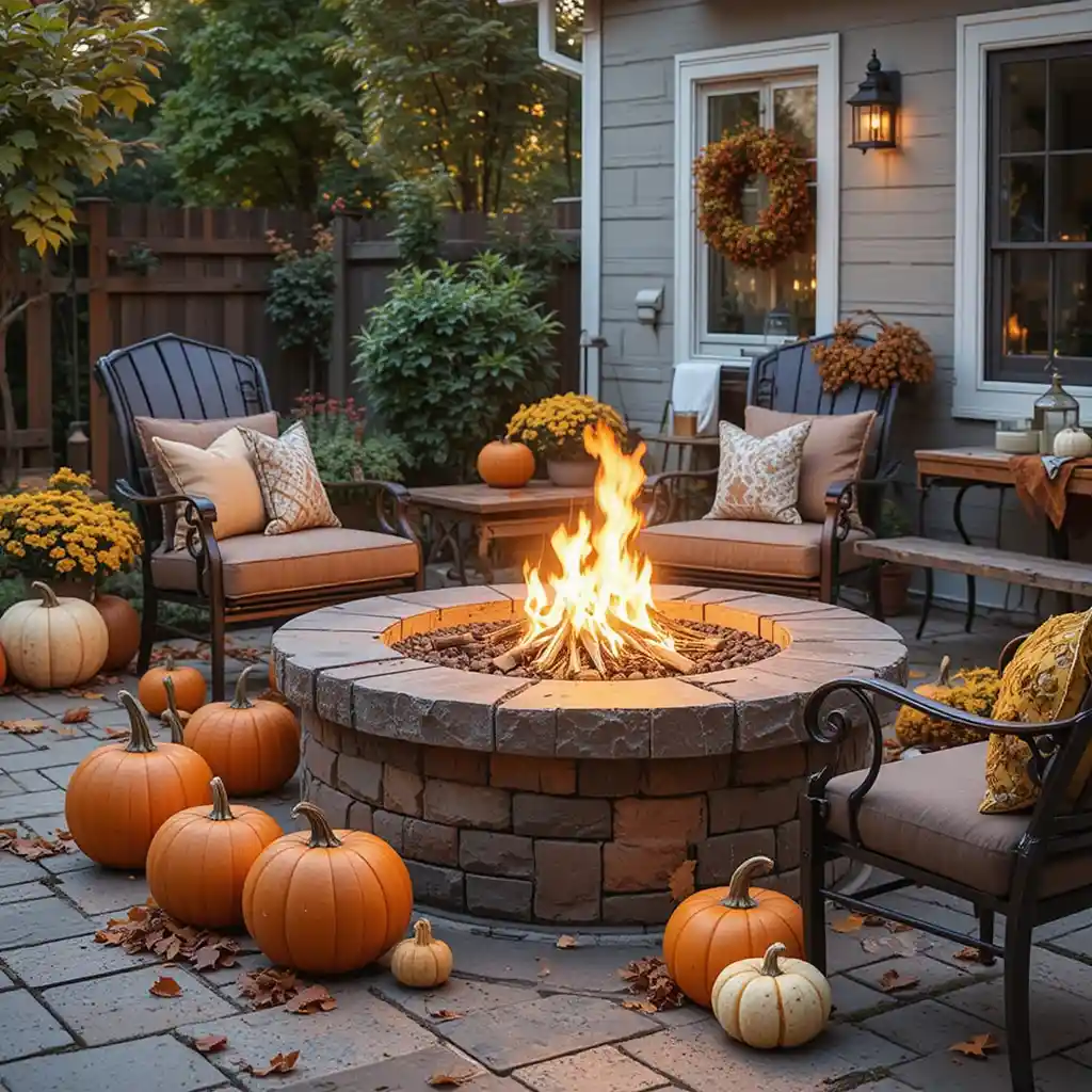 Place pumpkins around your fire pit area for a simple seasonal upgrade. Use flameless candles inside hollow pumpkins for safe yet stylish lighting.