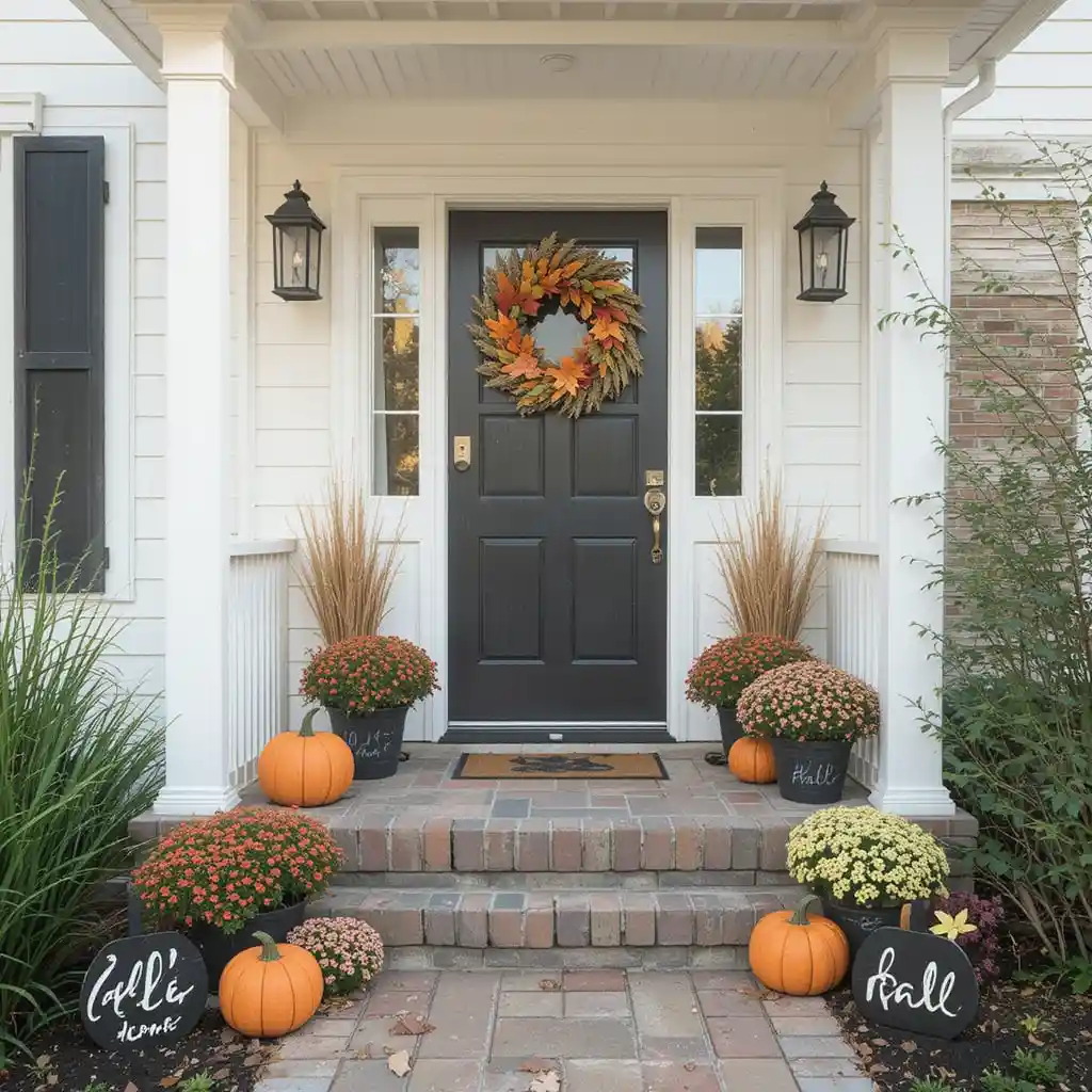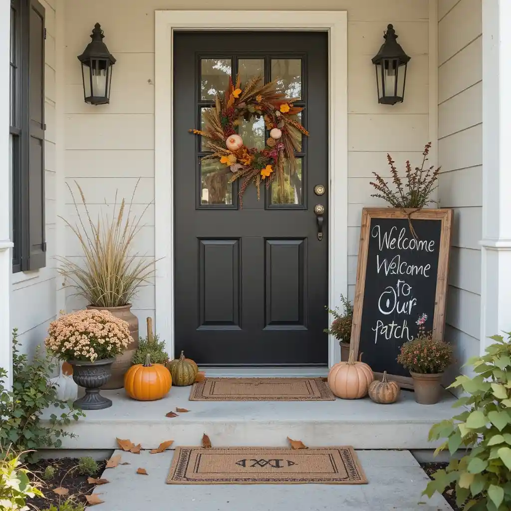 Lean a rustic chalkboard on your porch with handwritten messages like “Welcome to Our Patch.” It’s easy to update weekly and makes your entry feel personal.