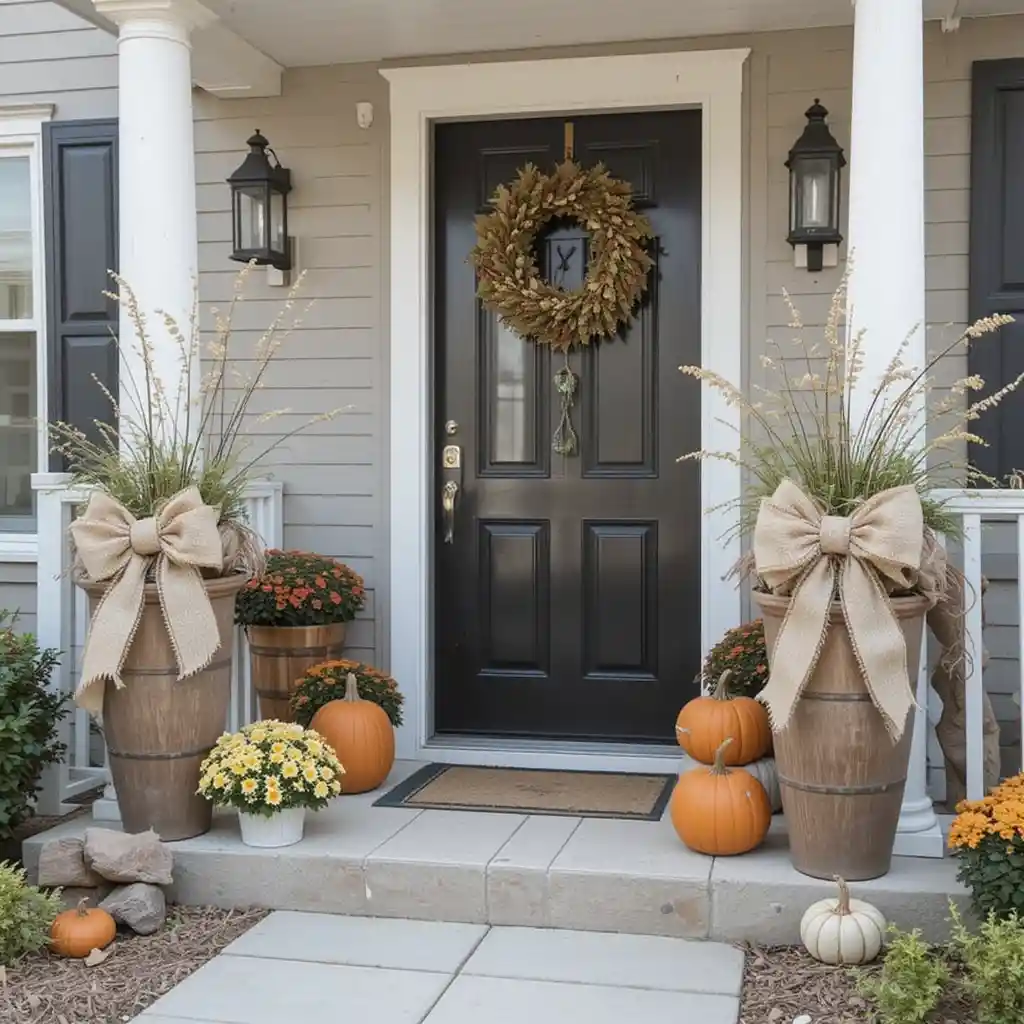 Tie large burlap bows around porch railings or plant pots. This adds a simple, rustic charm that blends beautifully with other fall textures.