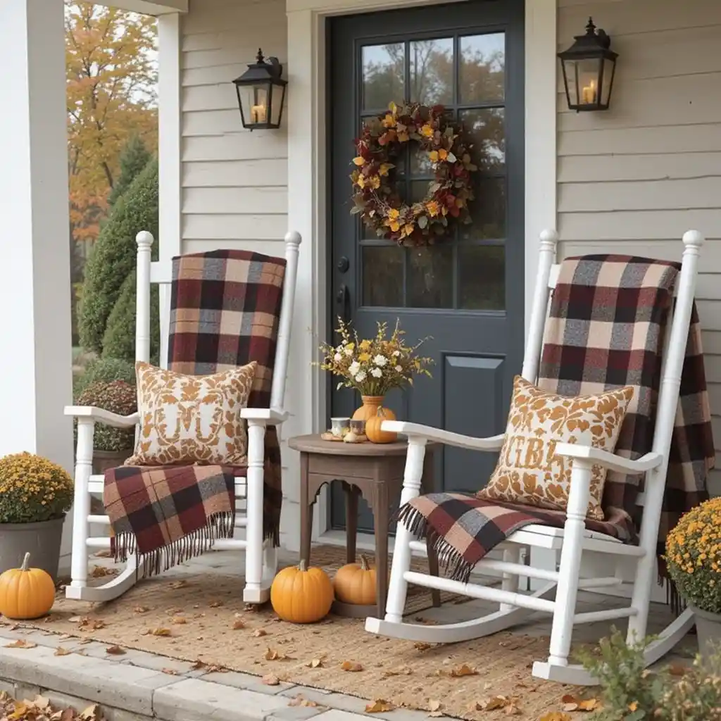 Set up classic rocking chairs with plaid throws and a side table holding a small pumpkin and warm cider. It’s a perfect setup for enjoying crisp fall mornings or evenings.