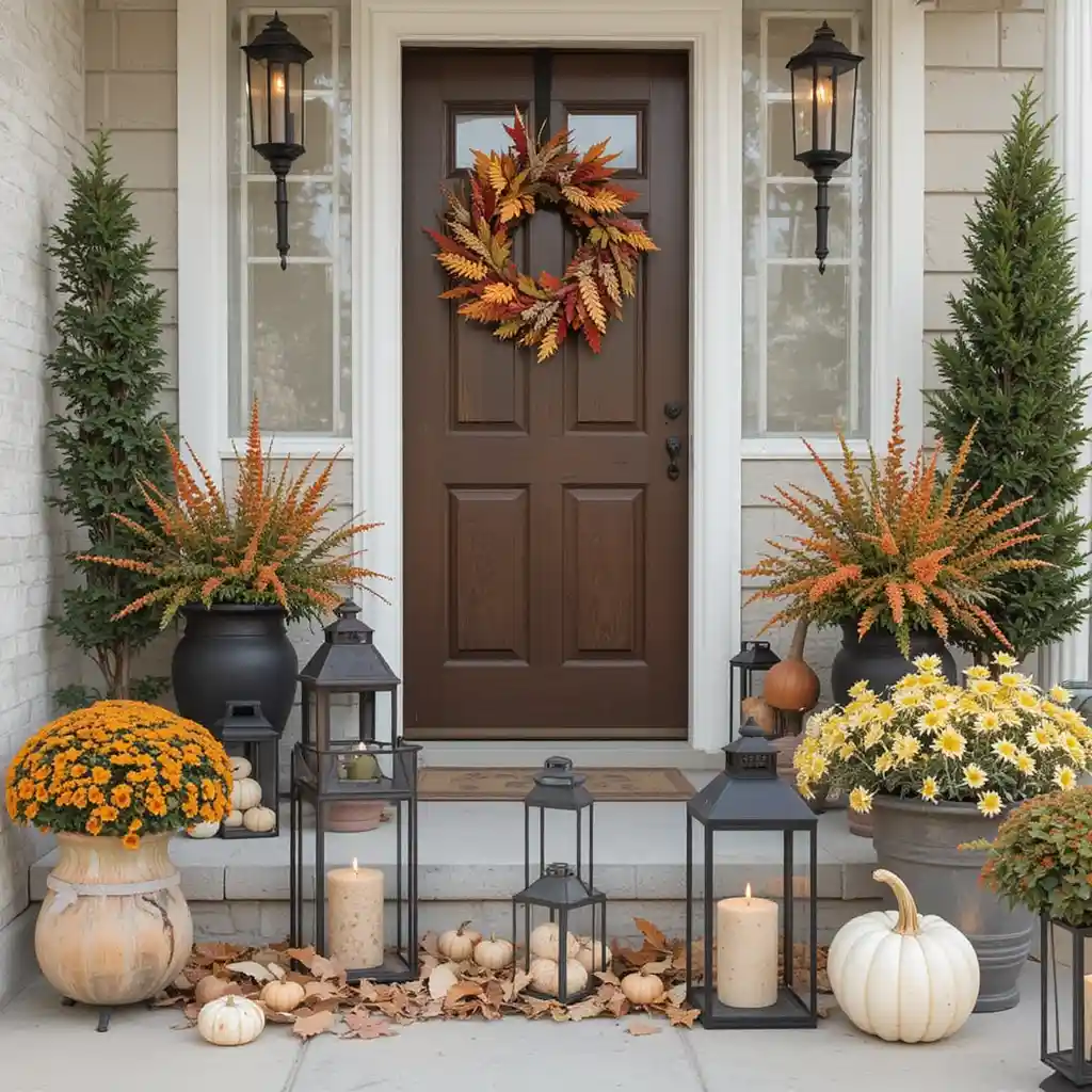 Arrange black or bronze lanterns filled with flickering LED candles or tiny pumpkins. They provide ambient lighting that feels welcoming as the sun sets earlier.