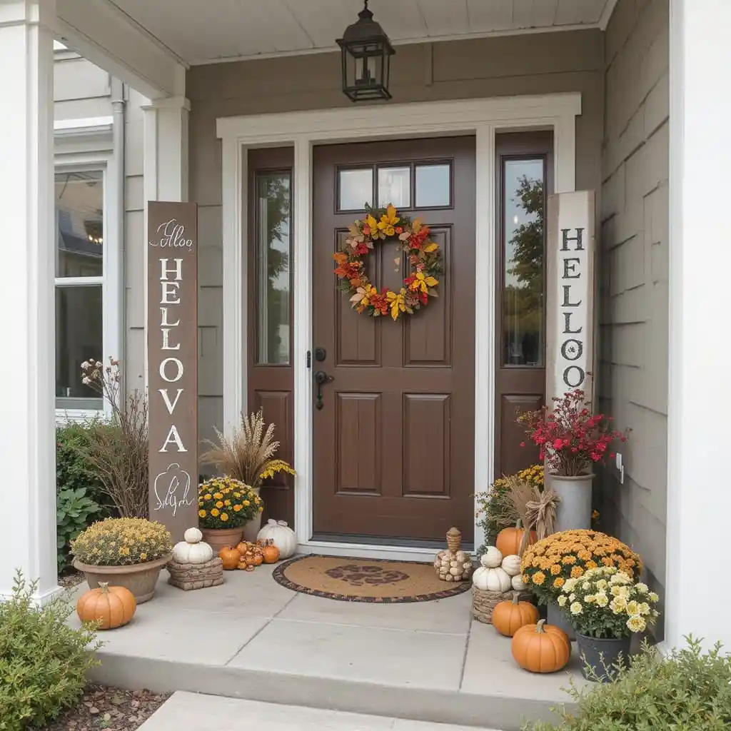 Use tall vertical signs with messages like “Hello Fall” or “Pumpkin Patch” to enhance porch corners. These add vertical dimension and a charming personality to your outdoor setup. Fall Outdoor Decor Ideas
