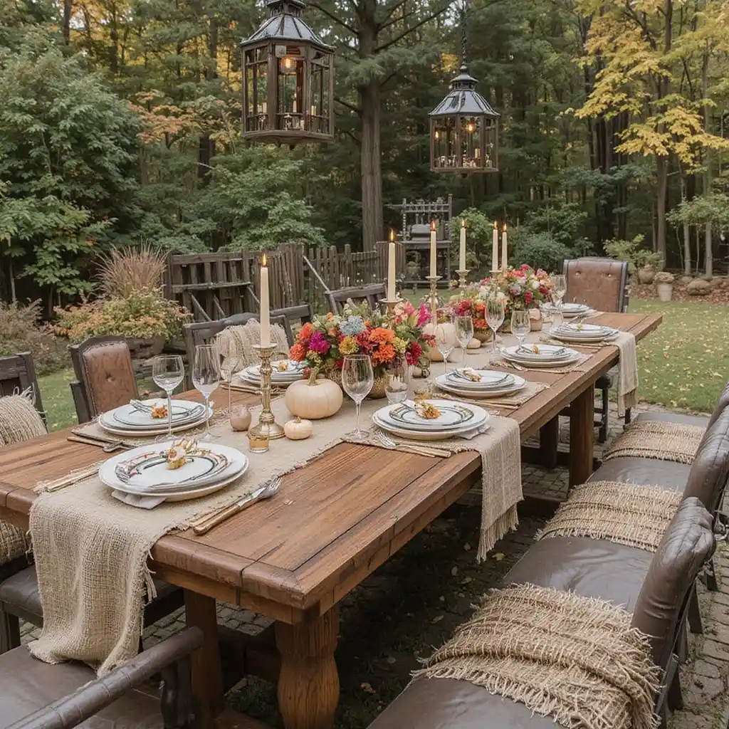 Use a long wooden table as the centerpiece of your outdoor setup. Add burlap runners, antique dinnerware, and woven placemats for a cozy farmhouse feel that’s inviting and timeless.
