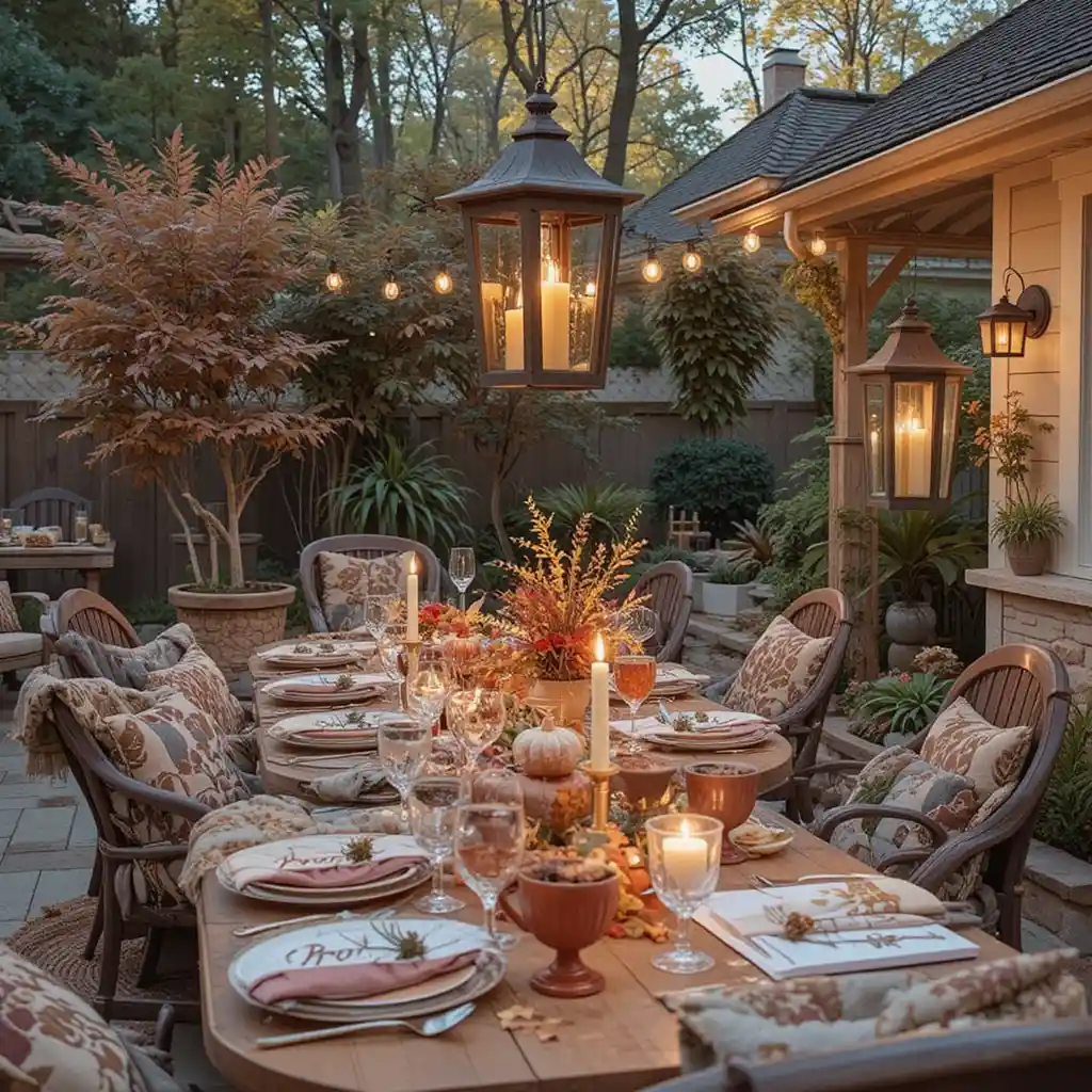 Place large lanterns with LED flameless candles around the dinner area. They offer soft lighting and enhance the cozy vibe of the fall night. Fall Outdoor Dinner Party Ideas
