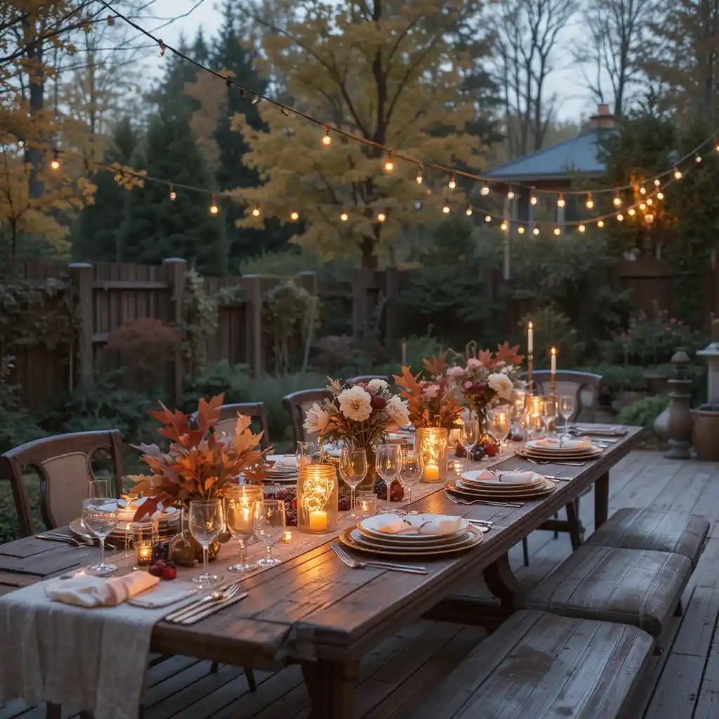 Hang warm-toned string lights above your dining space or in surrounding trees. These add a magical glow and create an intimate atmosphere perfect for evening gatherings.
