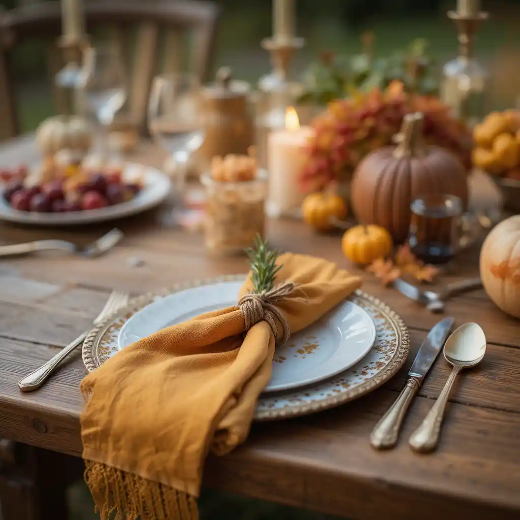 Swap plain paper napkins for cloth napkins in autumnal hues like mustard, rust, or burgundy. Tie them with twine and a sprig of rosemary for a refined finish.