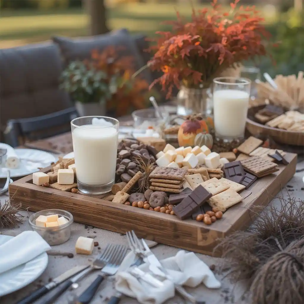Offer a build-your-own s’mores station with graham crackers, chocolates, and marshmallows neatly arranged in a wooden tray. Kids and adults will love the fun twist on dessert.
