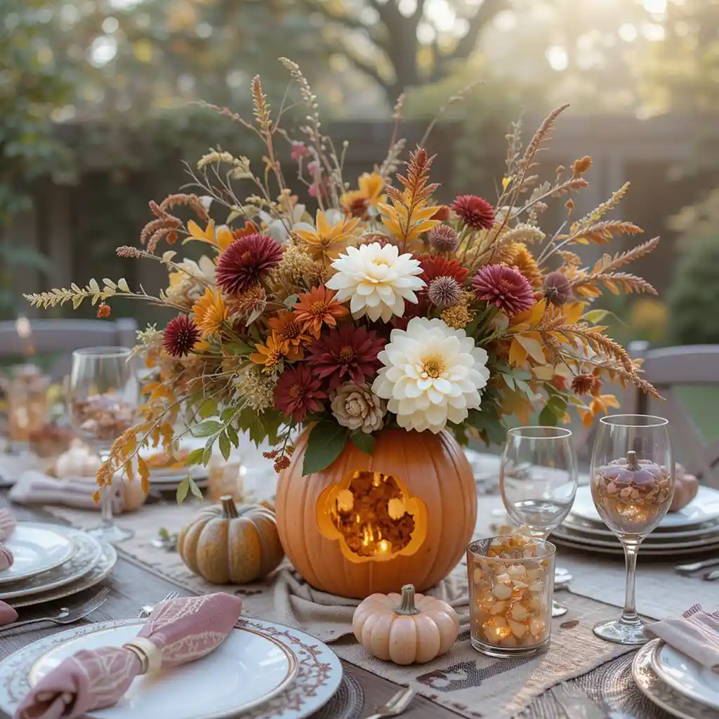 Hollow out a medium-sized pumpkin and use it as a vase for fresh seasonal flowers. It’s a stunning and creative centerpiece idea that screams fall.