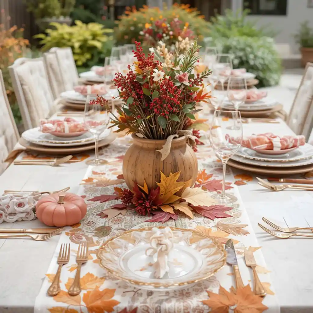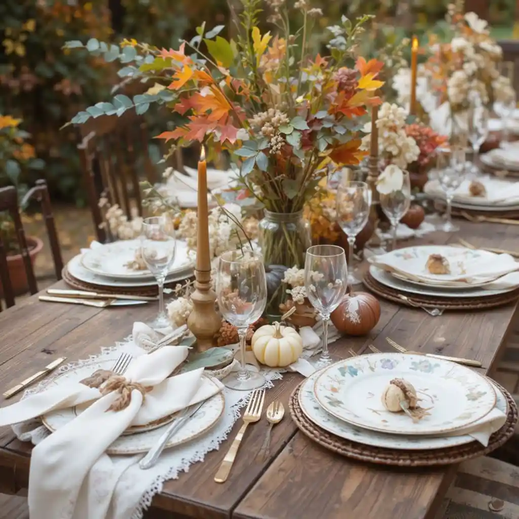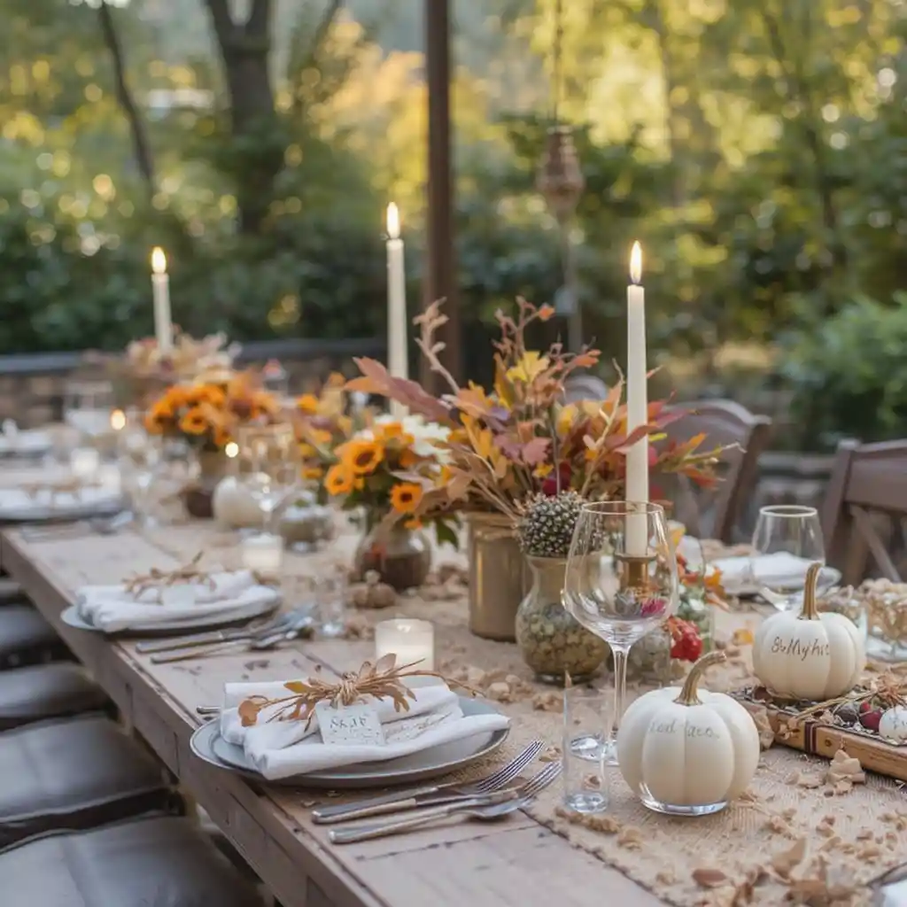 Arrange a variety of mini pumpkins, gourds, and unscented candles in the center of your table. Use different shapes and tones for a layered and natural look that captures fall’s beauty.