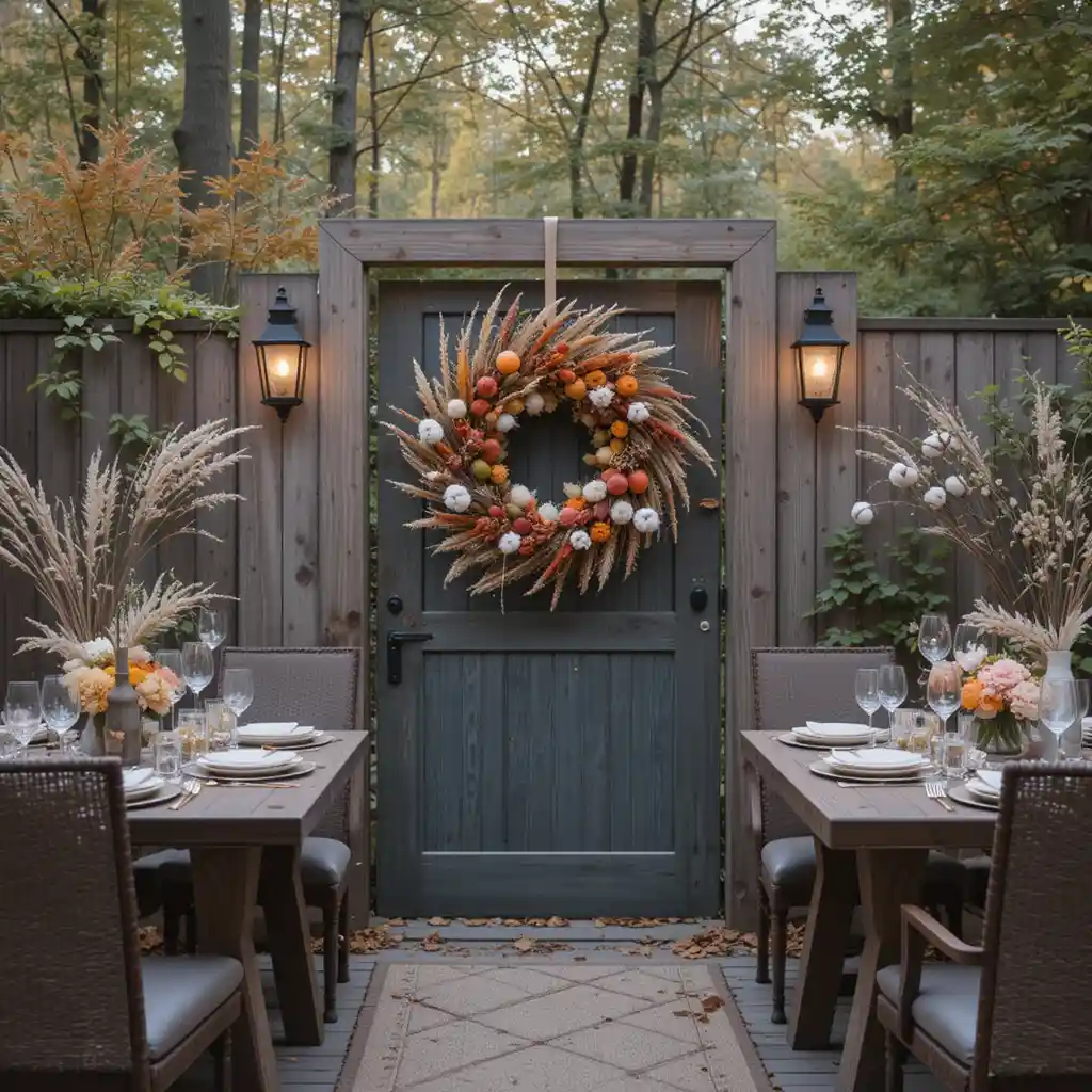 Hang a neutral-toned fall wreath on your garden gate or patio door to welcome guests with a seasonal touch. Choose materials like dried wheat, pampas grass, or cotton stems.