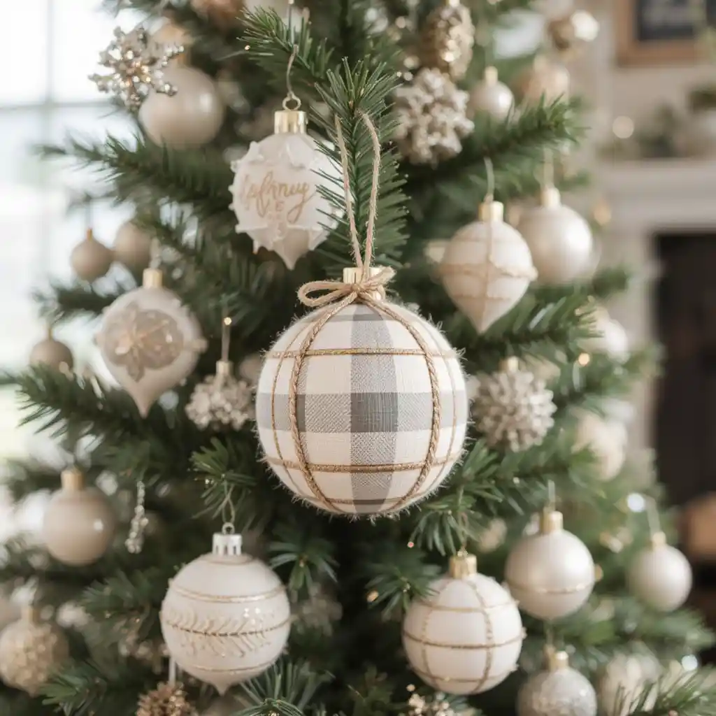 Add hand-sewn fabric ornaments in neutral shades or plaid patterns. They bring a soft, personalized farmhouse feel to the tree.