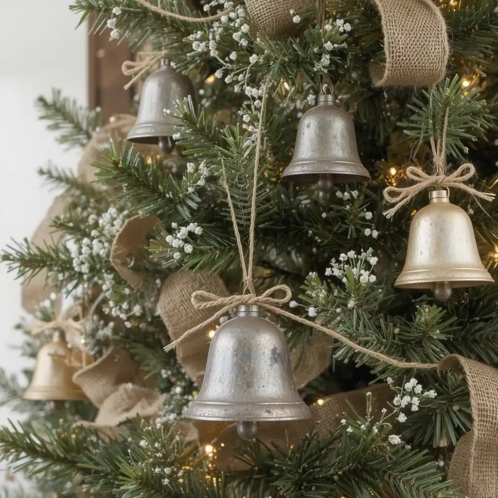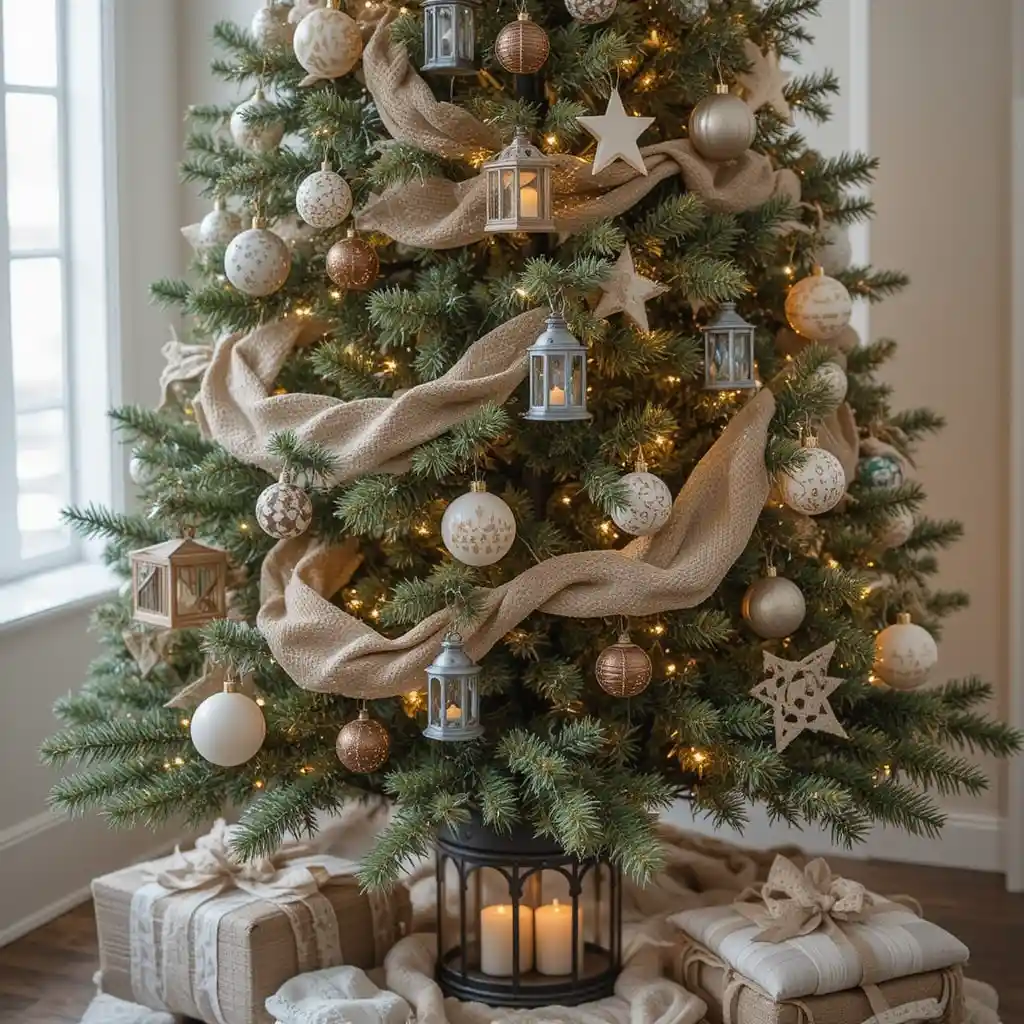 Wrap your tree with burlap ribbon instead of traditional garland. It adds rustic texture and blends perfectly with farmhouse-inspired ornaments.