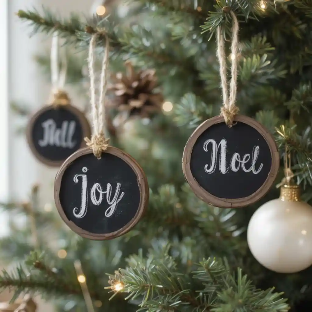 Hang small chalkboard ornaments with festive words like “Joy” or “Noel.” They feel homemade and rustic while adding character.
