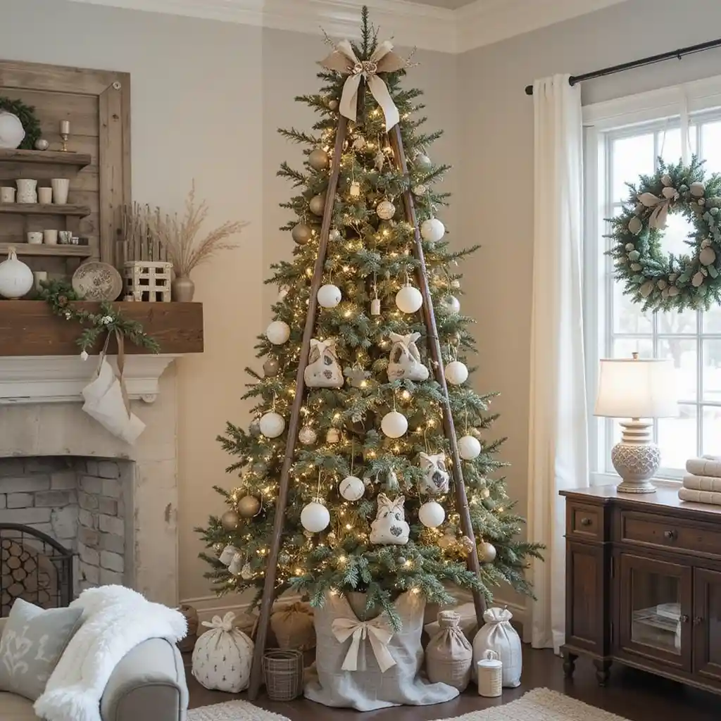 Instead of a traditional tree, use a wooden ladder decorated with lights, greenery, and ornaments. This creative idea adds a unique rustic flair.