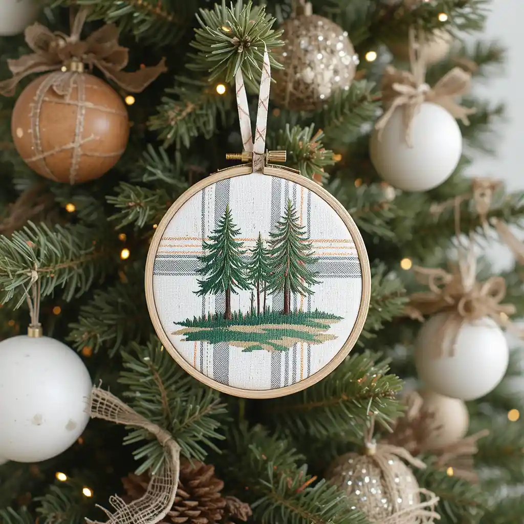 DIY embroidery hoop ornaments with plaid or linen fabric. These handmade pieces bring authentic farmhouse character to your tree.