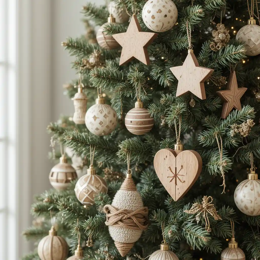 Decorate your tree with wooden ornaments shaped like stars, snowflakes, or hearts. Their natural finish gives a handcrafted farmhouse charm.