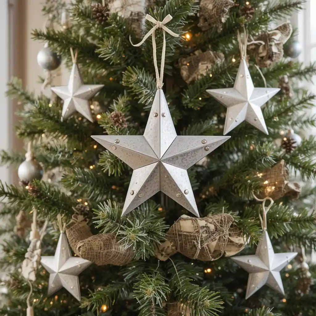 Decorate with tin star ornaments for a rustic, old-fashioned farmhouse vibe. Their simple metallic shine complements natural tones.