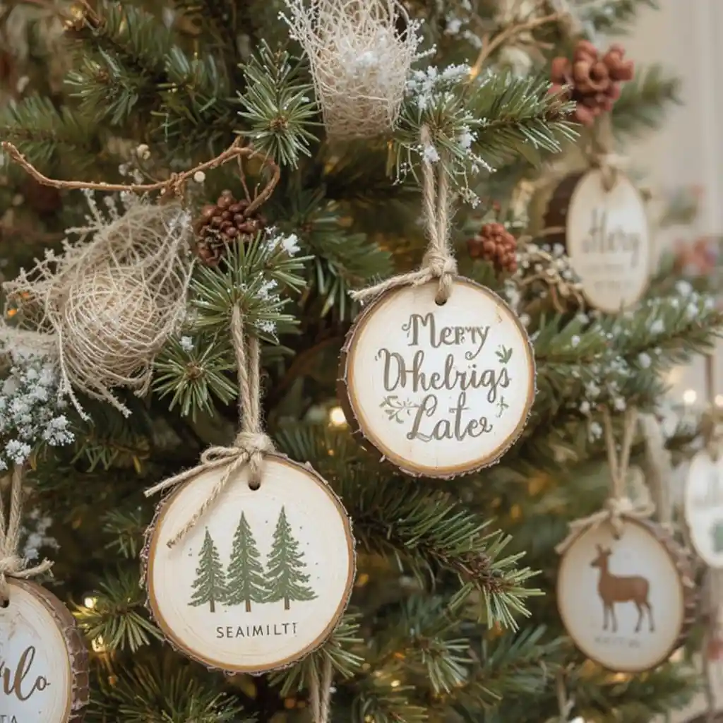 Add ornaments made from wooden slices with burned or painted holiday designs. They bring a handcrafted, rustic farmhouse look.
