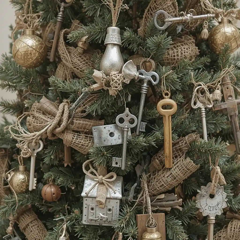 Hang antique keys, vintage tools, or rustic trinkets for a one-of-a-kind farmhouse Christmas tree style.