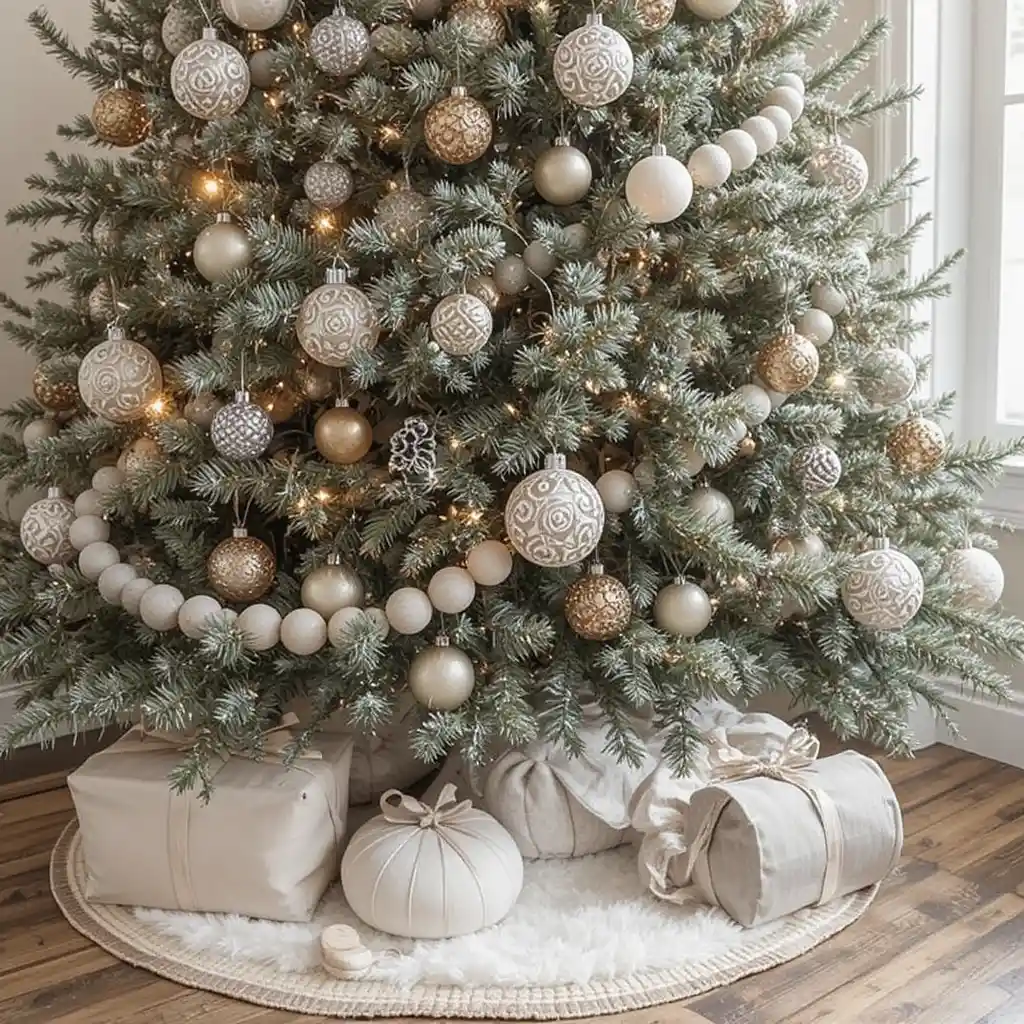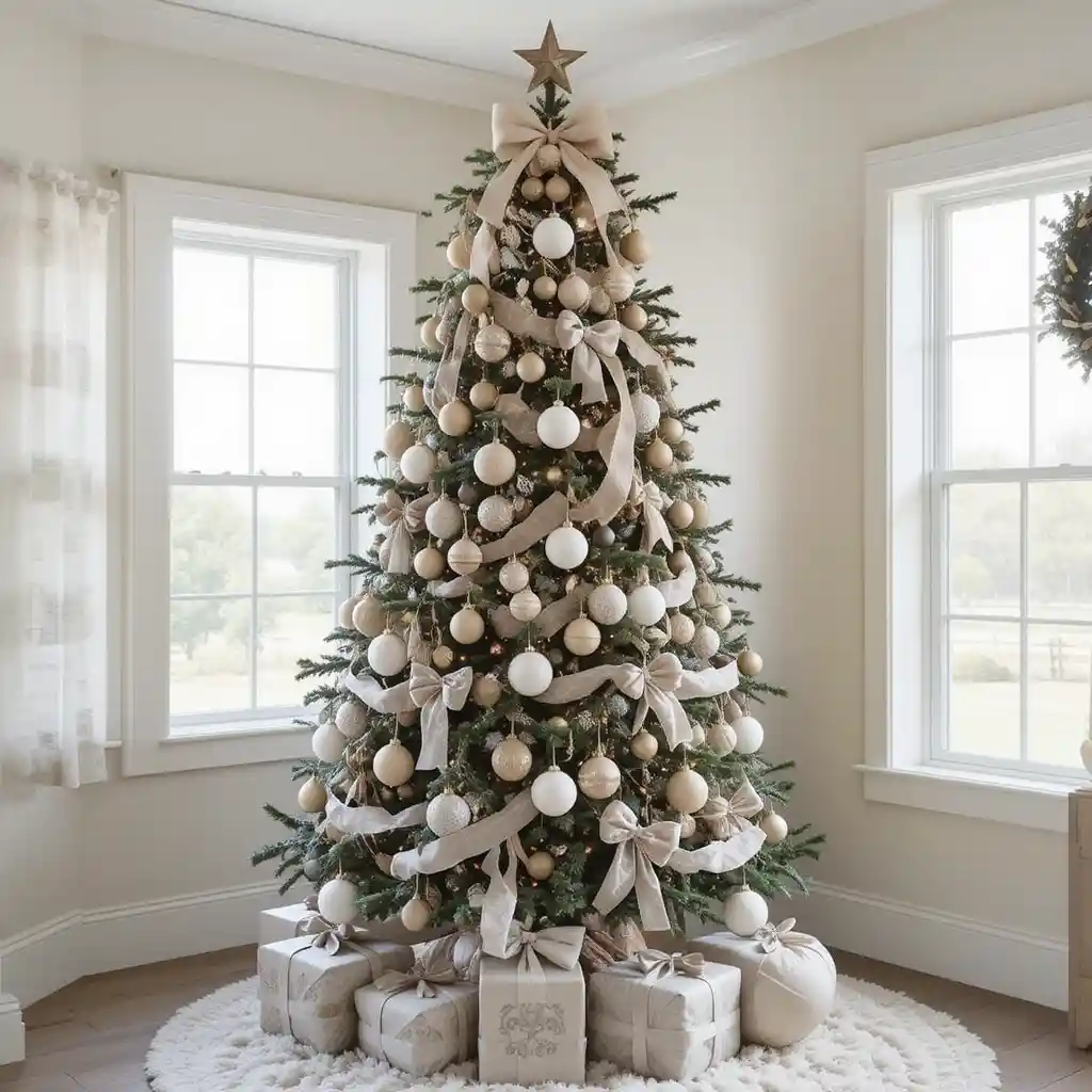 Stick to neutral tones like cream, beige, and soft gray for ornaments and ribbons. It creates a calming farmhouse holiday aesthetic.