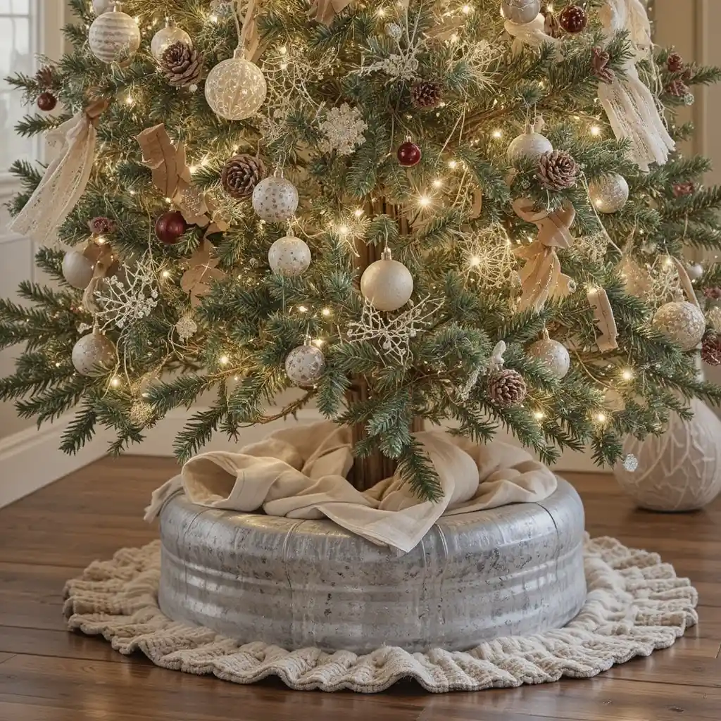 Swap the traditional tree skirt for a galvanized metal tree collar. It adds a rustic farmhouse foundation and keeps the setup tidy. Farmhouse Christmas Tree