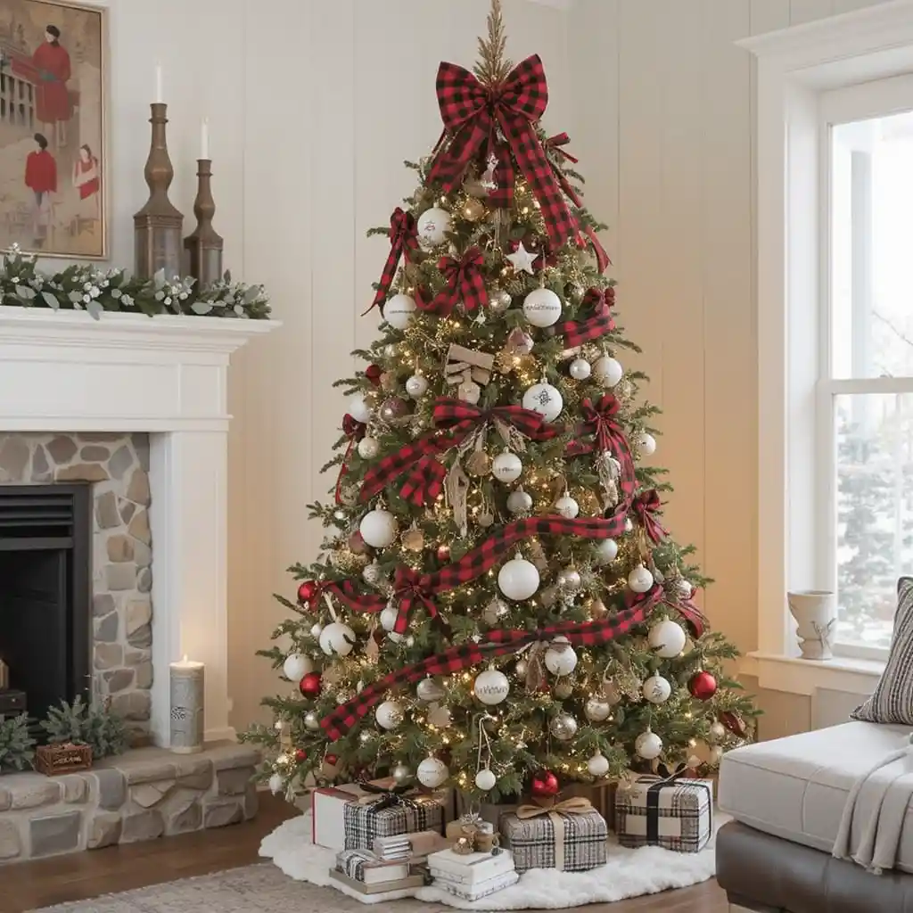 Use buffalo check ribbons, bows, and ornaments in black and red for a cozy farmhouse Christmas tree that feels both rustic and bold. Farmhouse Christmas Tree