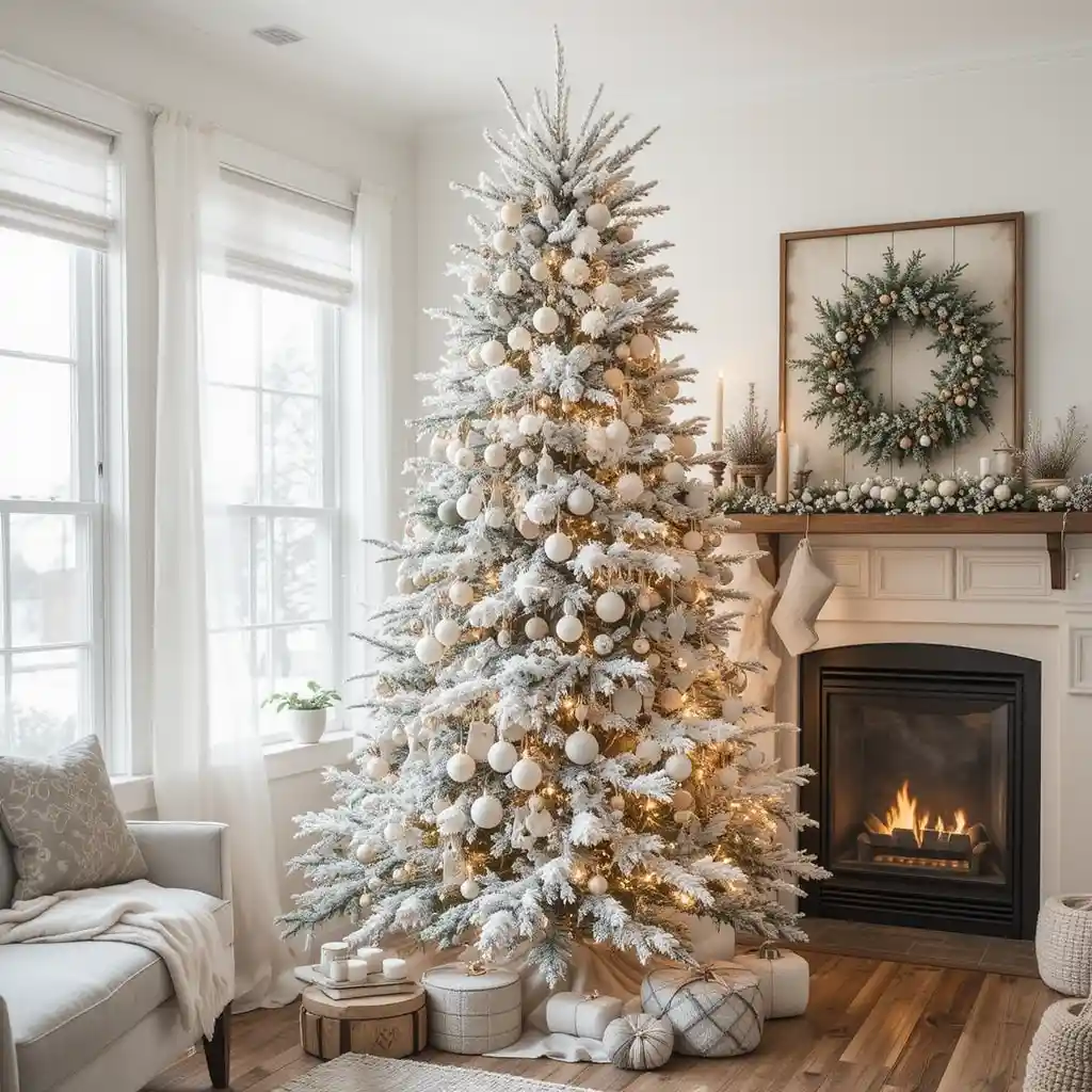Choose a flocked or whitewashed Christmas tree to mimic snowy branches. Pair with neutral ornaments for a farmhouse winter wonderland look. Farmhouse Christmas Tree