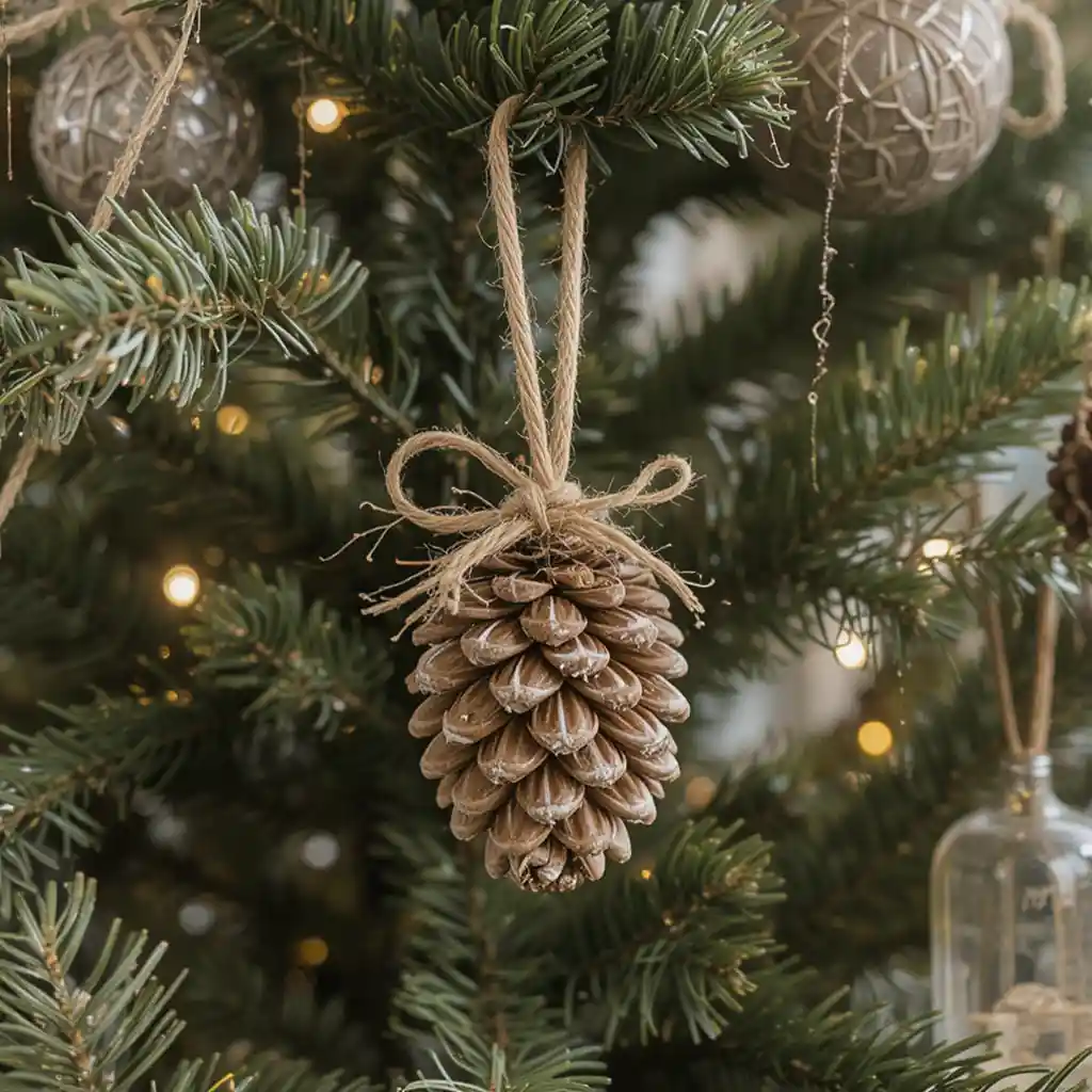 Use pinecones tied with twine as ornaments. They’re simple, natural, and blend seamlessly with farmhouse Christmas décor.