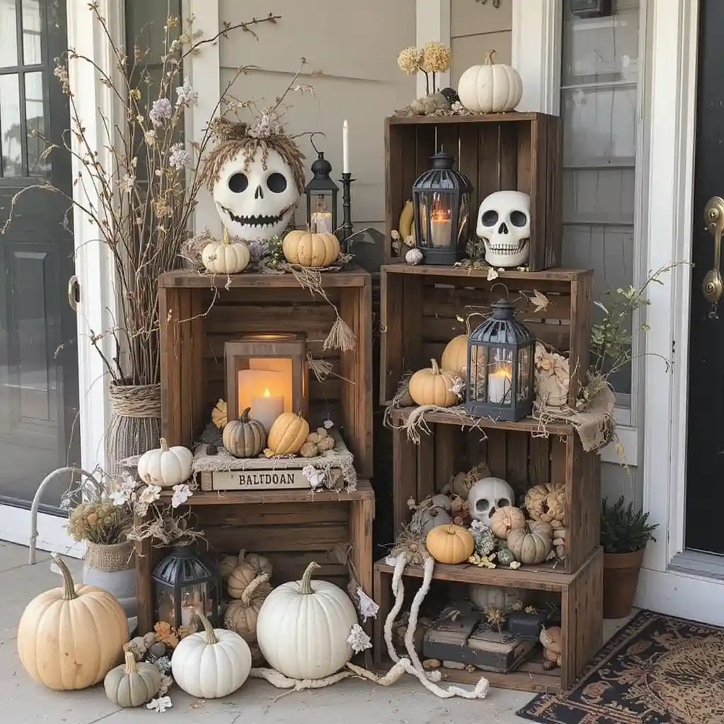 Stack wooden crates and fill them with pumpkins, skulls, or lanterns. This display works great indoors or on the porch. Farmhouse Halloween Décor