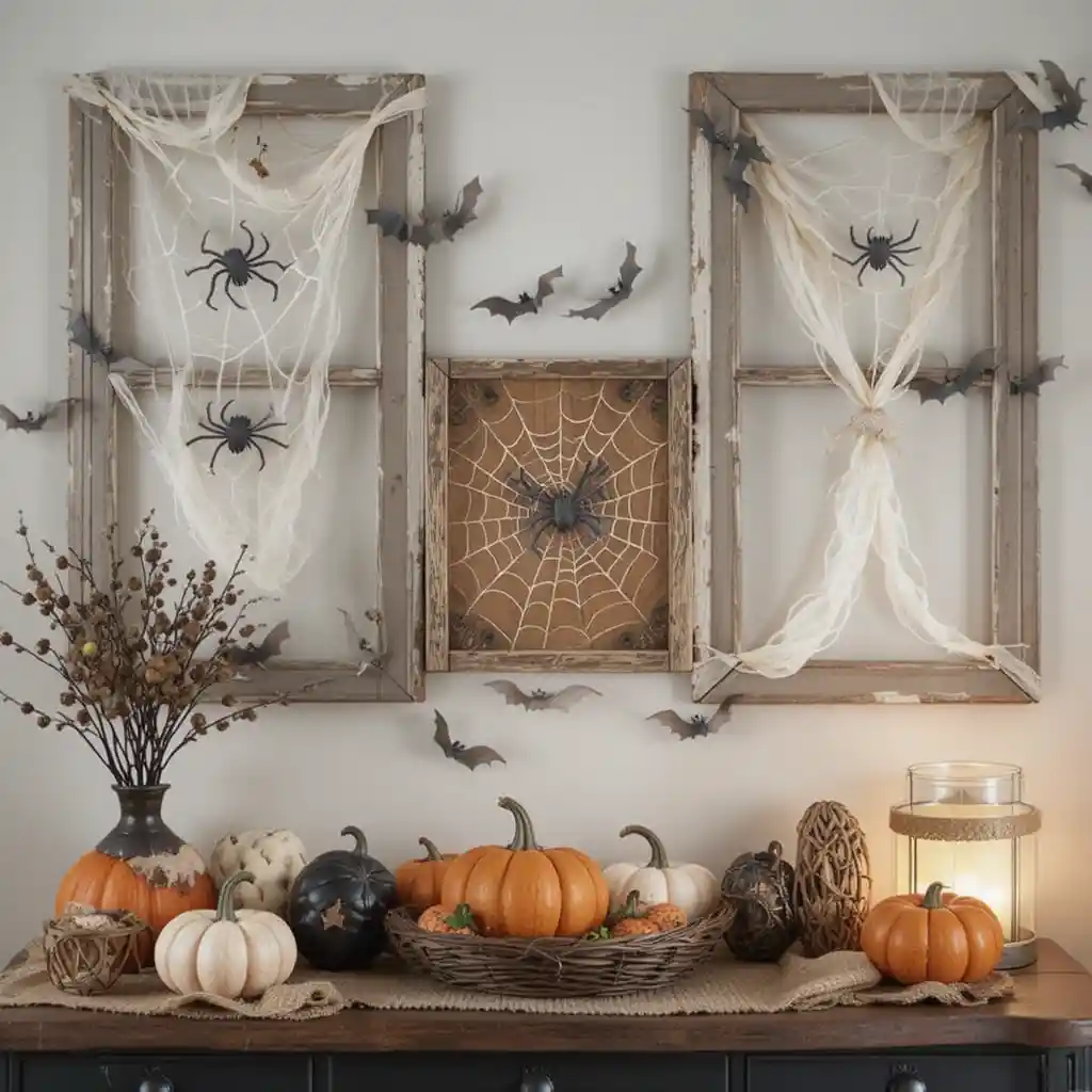 Hang old window frames on the wall and decorate with faux spider webs and bats. The distressed look adds authentic farmhouse charm.