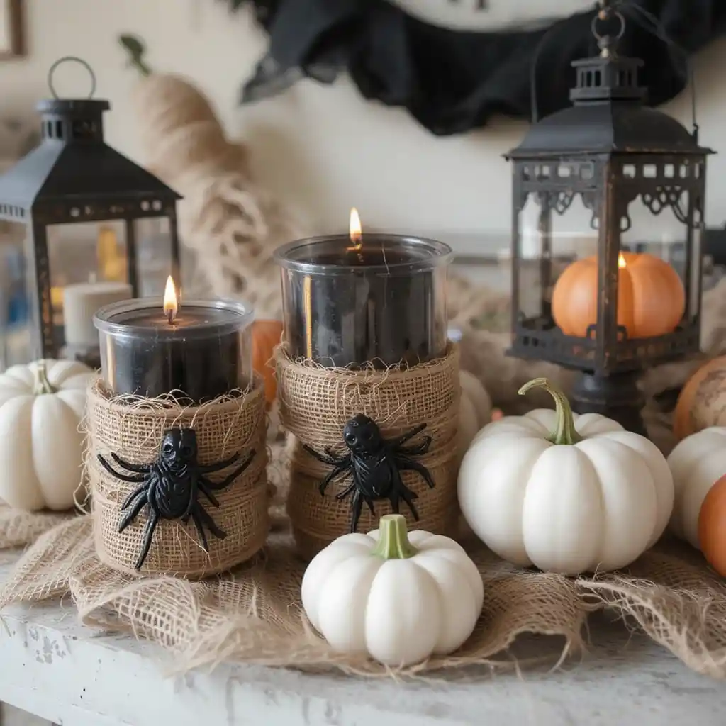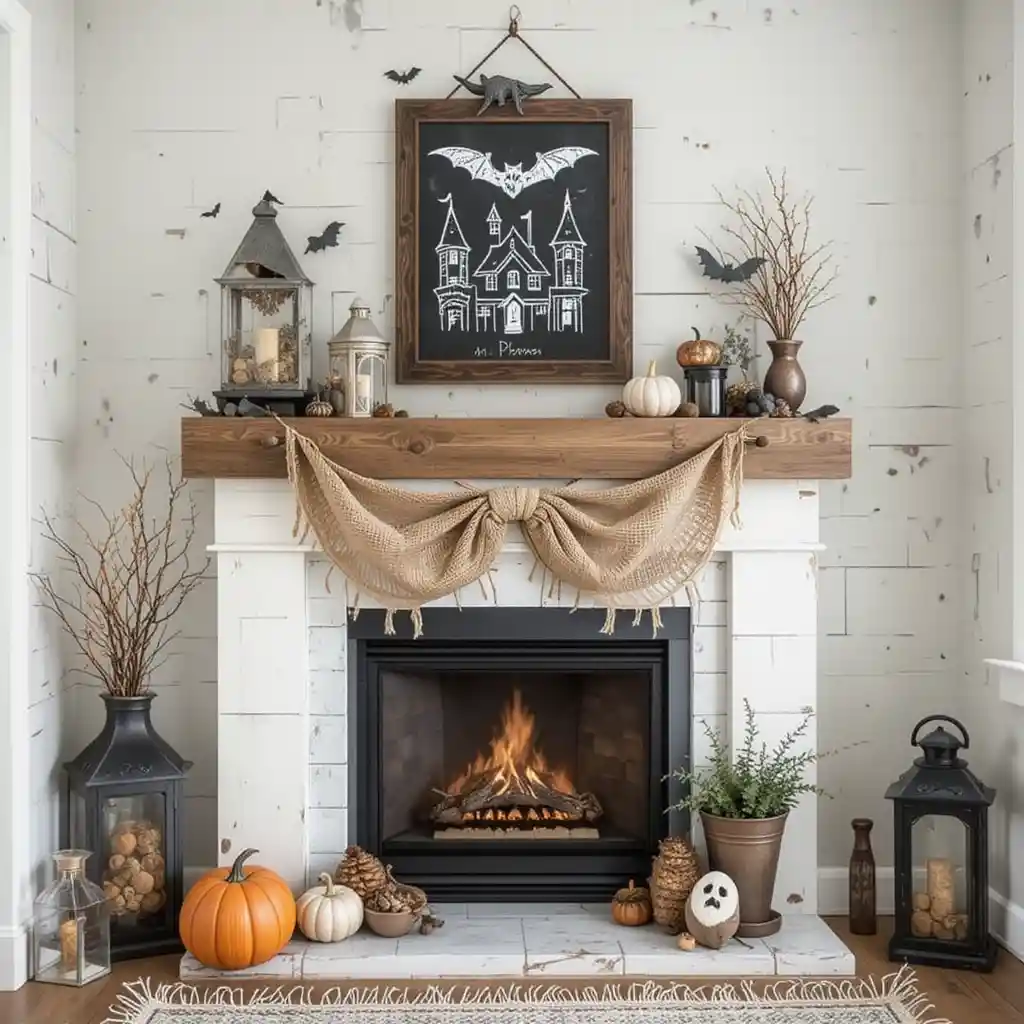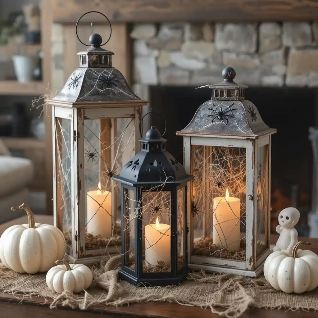 Place distressed farmhouse lanterns on tables or by the fireplace with flickering LED candles. Add spiderwebs for extra Halloween character.