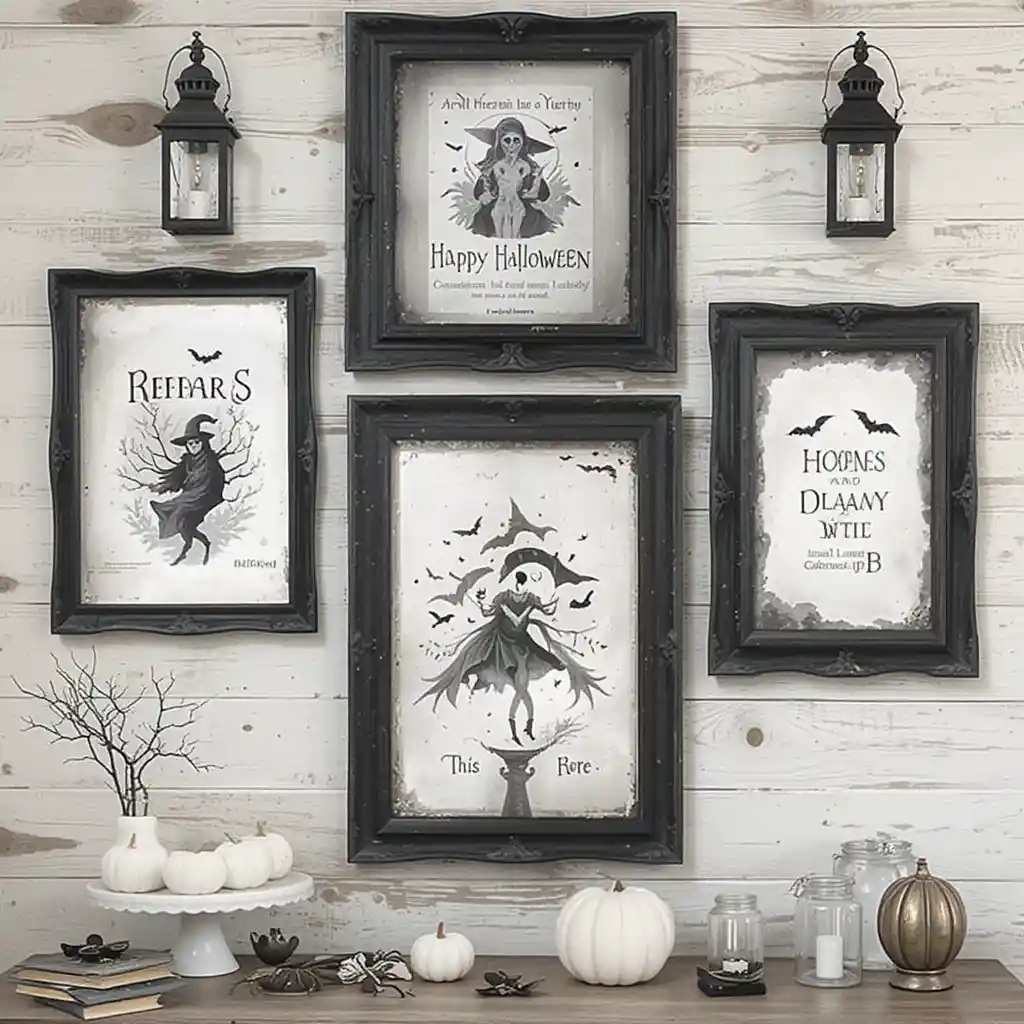 Hang black-framed Halloween prints on a shiplap wall. This simple idea creates a rustic backdrop for seasonal style. Farmhouse Halloween Décor
