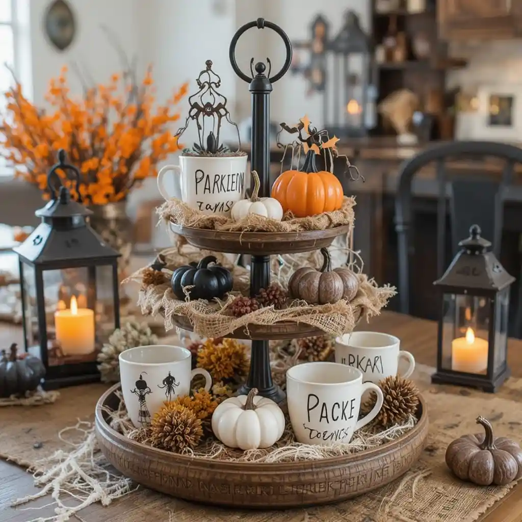 Use a tiered tray to display Halloween mugs, mini pumpkins, and farmhouse trinkets. Perfect for coffee corners or kitchen décor.