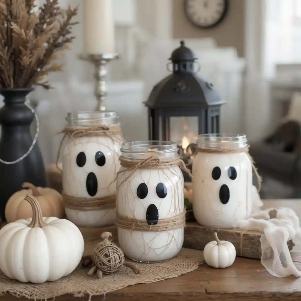 Use mason jars as lanterns filled with LED candles. Wrap them in twine or paint them with ghost faces for a rustic yet spooky vibe. Farmhouse Halloween Décor
