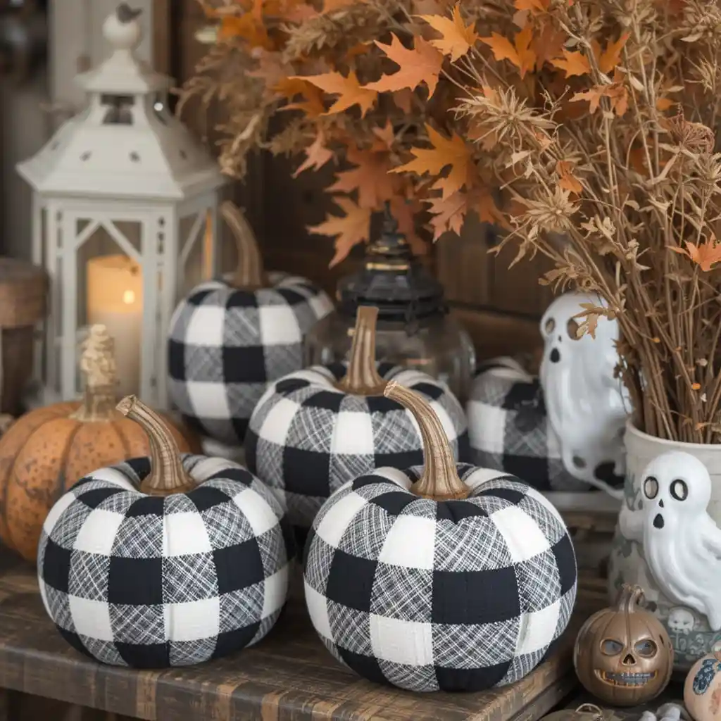 Swap bright orange pumpkins for buffalo check fabric pumpkins. The pattern blends seamlessly with farmhouse décor and still feels festive for Halloween.