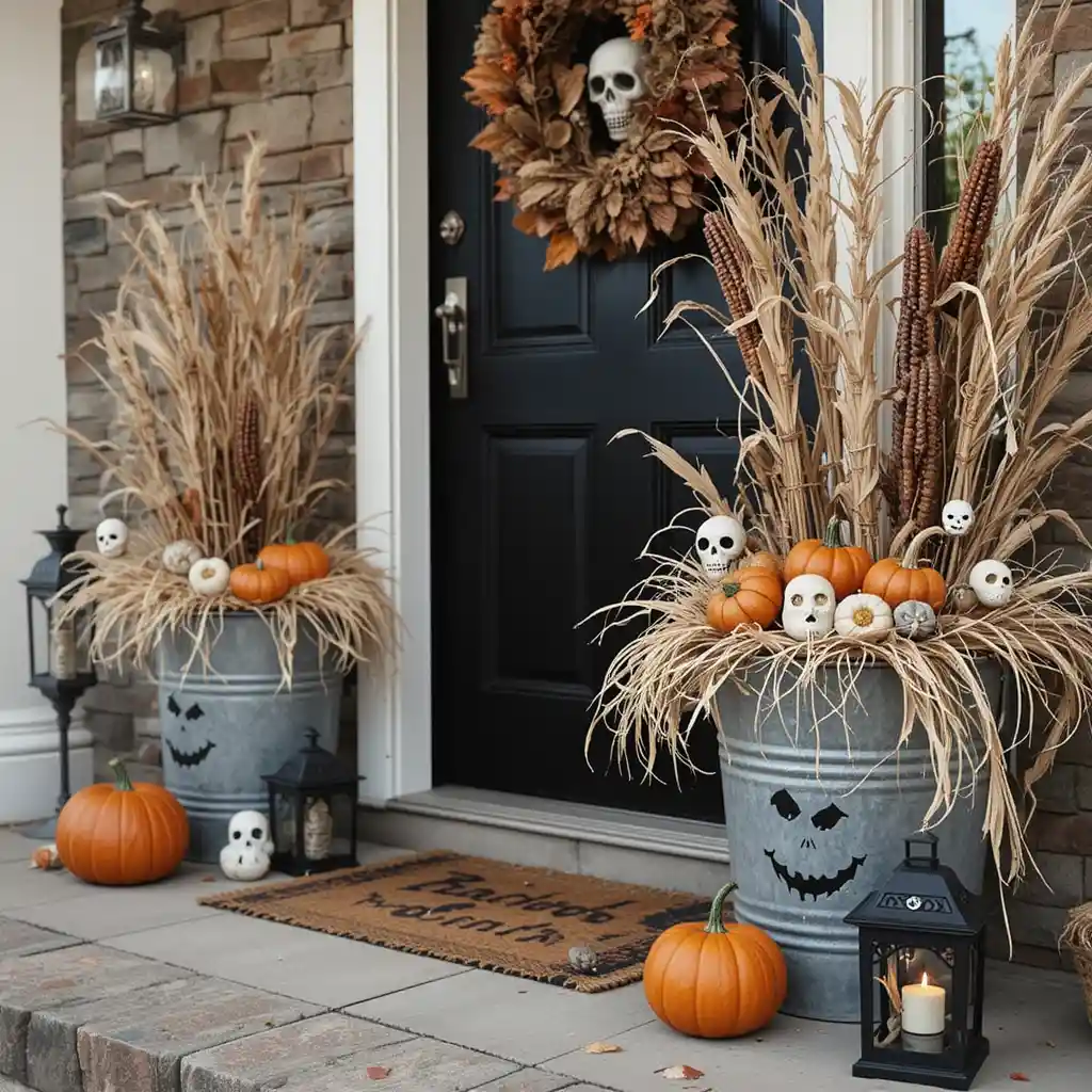 Place galvanized metal buckets on your porch filled with hay, small pumpkins, and dried corn stalks. They look rustic, cozy, and Halloween-ready. Farmhouse Halloween Décor