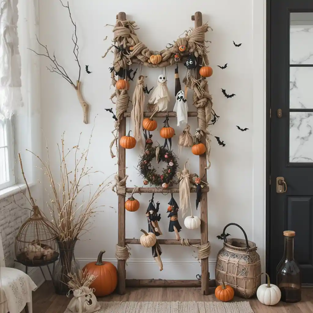 Lean a wooden ladder against the wall and hang seasonal accents like pumpkin garlands, small wreaths, or spooky fabrics.