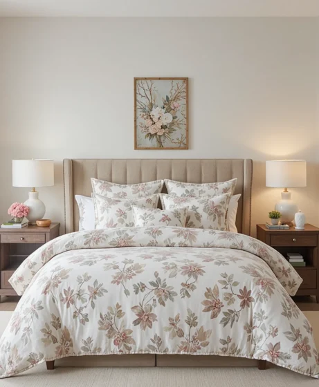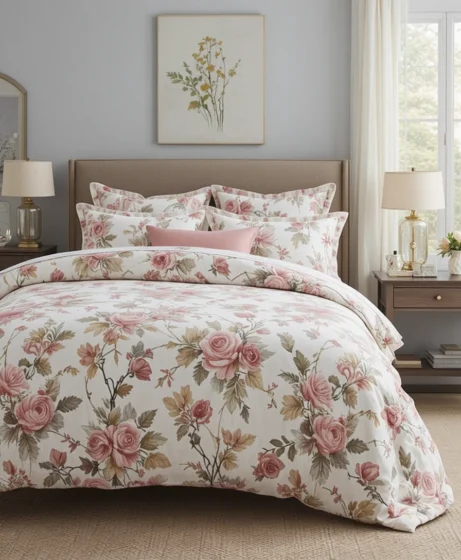 For a glamorous feel, look for floral bedding with subtle metallic accents. Gold-thread detailing or satin finishes add elegance. This works well in master bedrooms seeking a high-end look.